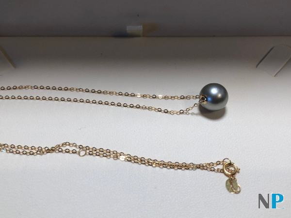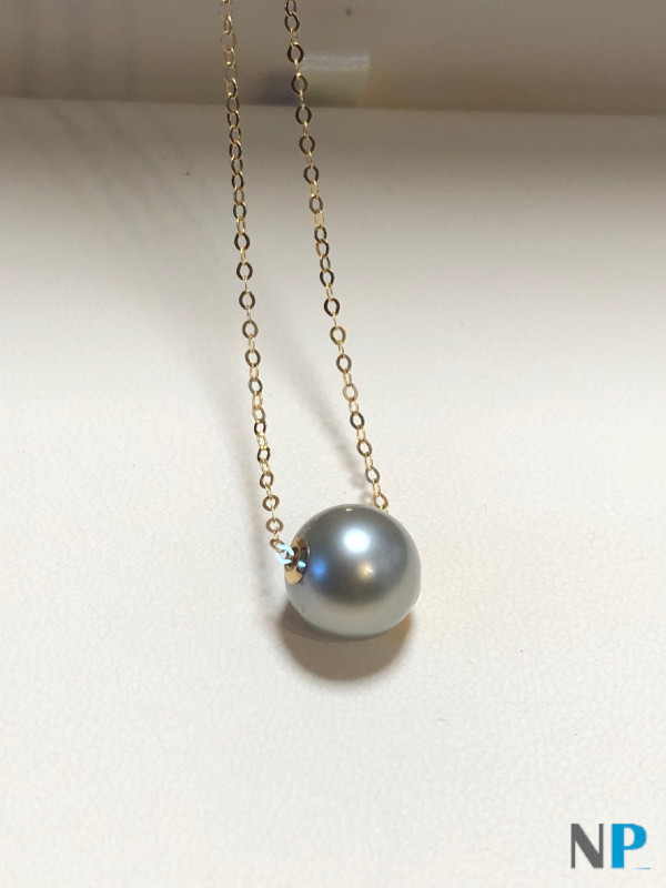 Perla di Tahiti, di colore chiaro, grigio blu con riflessi argento. La perla ha due cerchi in oro inseriti che fanno scivolare la perla sulla catenina in oro giallo 18 carati, in questo modo la perla non si rovina al passaggio sulla catenina. La perla è perfettamente rotonda, bel lustro brillante, Qualità AAA, colore raro, chiaro grigio blu argentato