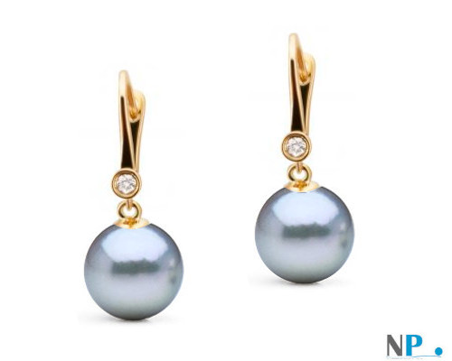 Un paio di orecchini molto eleganti, composti con perle rare Akoya del Giappone. Le perle Blu Akoya sono di colore naturale, chiare, con riflessi argentati. Le traversine sono in oro 14 carati, disponibili in oro bianco o in oro giallo, decorate con due diamanti, per un totale di 0,06 carati di diamanti.