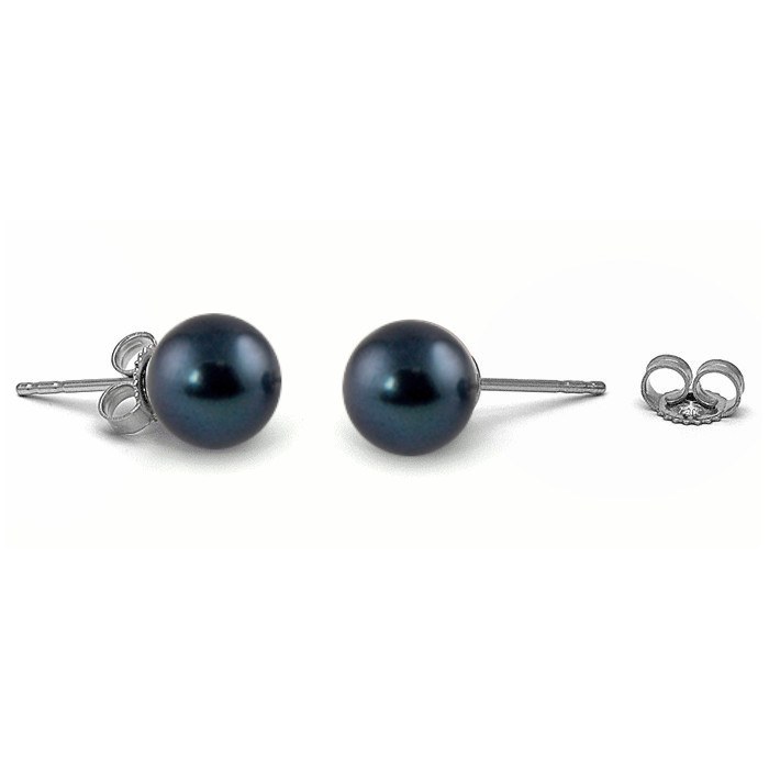 Grazioso paio di orecchini con perle di coltura di Acqua Dolce di dimensione 6-7 mm, le perle hanno forme ben rotonde, e sono di qualtà AAA: perle di coltura di acqua dolce con alto lustro. Il colore di queste perle non è naturale poiché solo le perle di Tahiti sono nere naturalmente. Le perle nere di acqua dolce subiscono un trattamento, il colore ottenuto non si alterna nel tempo. Perle nere dai riflessi blu notte.