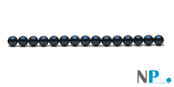 Filo di perle di 40 cm non montato, composto di perle Akoya nere coltivate in Giappone, perfettamente rotonde, lustro brillante, dimensione discreta, diametro medio-piccolo da 6-6,5 mm, con foro passante. Le perle sono disponibili in qualità AA+, i colori di queste perle "nere" sono  grigio scuro intenso con riflessi blu notte.