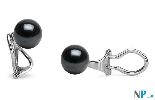 Paio di orecchini a clips per lobi non forati, disponibii in Oro Giallo o in Oro Bianco, oro 14 carati, oppure in opzione in oro 18 carati. Montati con le perle d'acqua dolce di vostra scelta: bianche, rosa pesca, lavanda o nere. I diametri delle perle sono a partire da 7-8 mm, in opzione diametri superiori fino a 10-11 mm. Le perle hanno forme ben rotonde, qualità AAA, bel lustro, bella superficie netta.