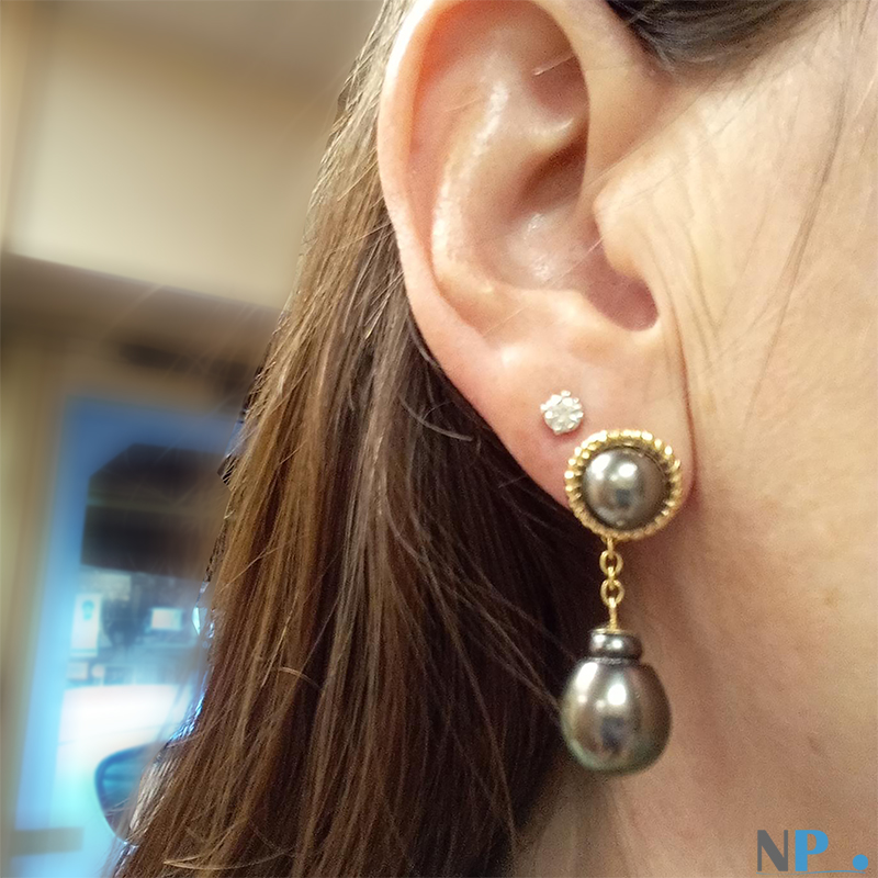 Orecchini oro 18k con 4 perle nere di Tahiti rotonde da 8-9 mm AAA e barocche da 11-12 mm