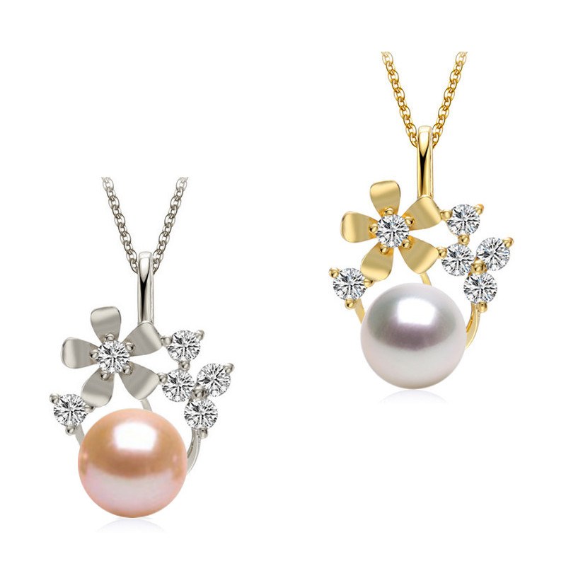 Pendente molto grazioso a motivo floreale realizzato in Oro 9 carati, decorato con diamanti, che porta una bella perla di coltura di acqua dolce, di medio-grande dimensione da 9-10 mm, forma rotonda, di qualità AAA. La perla è disponibile nei colori naturali Bianca, Rosa Pesca e Lavanda, o anche nera.